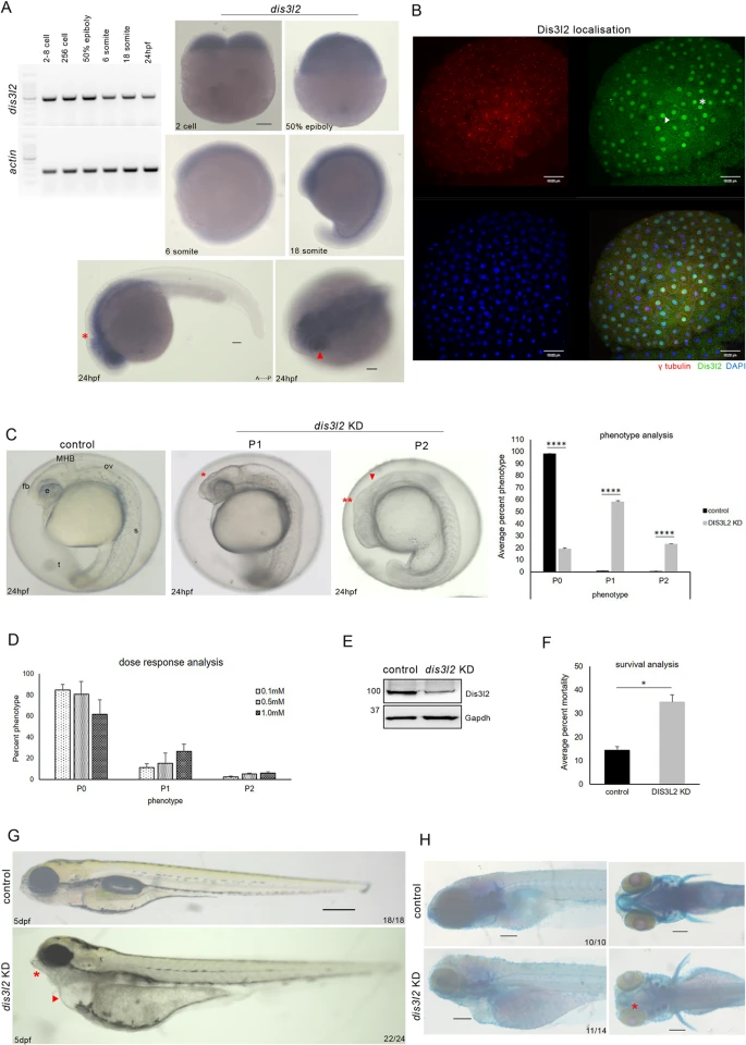 Fig. 1 dis3l2 depletion results in neurodevelopmental defects A: RT-PCR analysis of dis3l2 transcripts in different developmental stages. Zebrafish actin was used as the loading control (left). Whole-mount RNA in situ hybridization showing dis3l2 transcripts during early development. Scale bars, 100 μm (right). B: Sum projection confocal image of 256-cell stage control embryos showing endogenous Dis3l2 localization. Blue/DAPI - DNA, green– DIS3L2, red– γ tubulin. Scale bars, 50 μm. C: Gross morphological analysis of dis3l2 depleted embryos by morpholino in comparison to control embryos at 24 hpf showing forebrain defects (red asterisks), midbrain-hindbrain boundary defects (red arrowhead) Quantification of percent phenotype of 1mM dis3l2 morphants as compared to stage-matched control. Data are shown as mean + SEM, *p < 0.05, **p < 0.01, ***p < 0.001. n = 3 for each experiment, with a minimum of 40 embryos per experiment. D: Percent phenotype of dis3l2 morphants in different concentrations of morpholino. E: Western blot analysis showing Dis3l2 levels by western blot in dis3l2 morpholino injected morphants. Gapdh was used as the loading control. F: Percent mortality of dis3l2 morphants with respect to control at 24 hpf. G: Bright field image of dis3l2 depleted larvae as compared to control larvae at 5 dpf. H: Skeletal preparations of dis3l2 morphants by bone and cartilage staining using Alizarin red S and Alcian blue respectively. Scale bars 50 μm