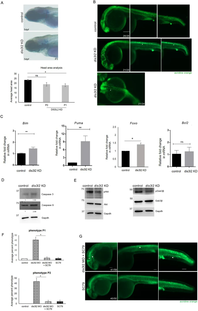 Fig. 3 dis3l2 is essential for neural crest survival. A: Skeletal preparation and head measurements of dis3l2 depleted larvae showing smaller head area with respect to control. B: Cell death analysis in the dis3l2 morphants by acridine orange staining. Acridine orange positive cells (white asterisk) shown in the head. Scale bars, 200 μm. C: Relative expression of Bcl2 family members– bim, puma, foxo, and bcl2 in dis3l2 morphants. Data are shown as mean + SEM, *p < 0.05, **p < 0.01, ***p < 0.001. n = 3 for each experiment, with a minimum of 100 embryos per experiment. D: Western blot analysis to show Caspase3 levels in morphants embryos. Gapdh was used as loading control. E: Western blot analysis showing phosphorylated Akt with respect to total Akt levels and phosphorylated Gsk3β with respect to total Gsk3β levels in dis3l2 depleted embryos. Gapdh was used as loading control. F: Rescue experiments showing phenotype P1 and P2 upon treatment with Akt activator SC79 in dis3l2 morpholino injected embryos. G: Cell death analysis by acridine orange staining in dis3l2 morpholino injected embryos treated with SC79 and WT embryos treated with SC79