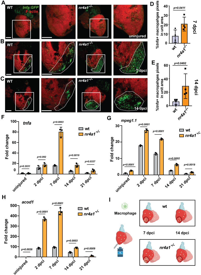 Abnormal accumulation of inflammatory macrophages in nr4a1 mutant. (A-C) Left: distribution of inflammatory macrophages in uninjured wild-type (WT) hearts and WT hearts at 7 and 14 dpci. Right: distribution of inflammatory macrophages in uninjured nr4a1 mutant hearts and nr4a1 mutant hearts at 7 and 14 dpci. Boxed regions in A-C show the approximate positions for quantification, and position of magnified images. Dashed lines show the wounded area. (D,E) Quantification of inflammatory macrophages in the unit area at 7 and 14 dpci. (F-H) qPCR results of inflammation-related genes tnfa, mpeg1.1 and acod1. All fold changes are calculated relative to the uninjured WT group in each panel. (I) Schematic showing inflammatory macrophage distribution in WT and nr4a1 mutant. Created in BioRender by Feng, D., 2025. https://BioRender.com/ynn17bt. This figure was sublicensed under CC-BY 4.0 terms. P-values<0.05 were considered statistically significant (two-tailed unpaired t-test, D,E; two-way ANOVA with Sidak test for multiple comparison correction and two-tailed unpaired t-test, F-H). Points in D and E show the individual samples. Data are mean±s.e.m. Scale bars: 275 µm.
