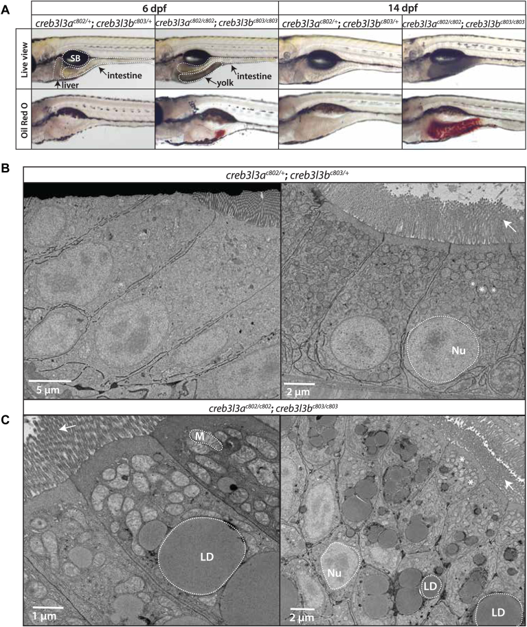 Accumulation of cytoplasmic lipid droplets in the enterocyte of creb3l3 mutant animals. A: Representative brightfield live images of creb3l3ac802/+;creb3l3bc803/+ and creb3l3ac802/c802;creb3l3bc803/c803 zebrafish larvae at 6 dpf. Unfed 6 dpf creb3l3 double mutants retain yolk and exhibit a yolk opacity phenotype compared to double heterozygous siblings, which suggests abnormal lipid droplet accumulation in the yolk syncytial layer. creb3l3ac802/c802;creb3l3bc803/c803 animals exhibit abnormal lipid accumulation by Oil Red O (ORO) staining in the posterior region of the yolk at 6 dpf. Images are representative of 3 independent experiments with 5–9 animals per experiment. Fasted 14 dpf creb3l3 mutants have opaque intestines under brightfield (Live view) and increased ORO staining throughout the intestine in fasted fish at 14 dpf. creb3l3ac802/+;creb3l3bc803/+ animals do not stain with ORO. Images are representative of 3 independent experiments with 5–9 animals per experiment. B: Representative electron microscopy images of creb3l3ac802/+;creb3l3c803/+ and creb3l3ac802/c802;creb3l3bc803/c803 animals fasted at 14 dpf (C). Large lipid droplets (LD) are present in creb3l3ac802/c802;creb3l3bc803/c803 animals. Images are representative of 3–6 animals per genotype. The nucleus and mitochondria are outlined by white dotted lines and lipid droplets are outlined by a solid line. Arrows points to microvilli on the apical side of the enterocyte. Creb3l3, cAMP-responsive element-binding protein 3–like 3; dpf, days post fertilization; Nu, nucleus; M, mitochondria; SB, swim bladder.