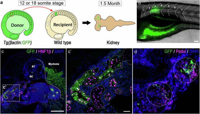 Fig. 3 Transplanted GFP+ somite contributed to mesonephric nephrons in recipient fish.