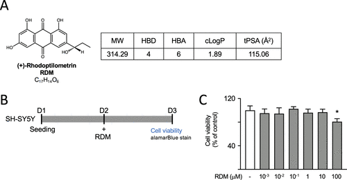 Fig. 1 RDM properties and its impact on cell viability. (A) Structure, formula, molecular weight (MW), hydrogen bond donor (HBD), hydrogen bond acceptor (HBA), calculated octanol–water partition coefficient (cLogP), and topological polar surface area (tPSA) of RDM. (B, C) The cytotoxicity of RDM against SH-SY5Y cells was assessed by using the alamarBlue assay. Cells were plated on day 1 and treated with RDM at concentrations ranging from 10–3 to 100 μM for 16 h on day 2, and cell viability was assessed using alamarBlue stain on day 3. The relative viability of control cells is presented as 100% for normalization. *p < 0.05 compared with the control group. RDM, (+)-rhodoptilometrin
