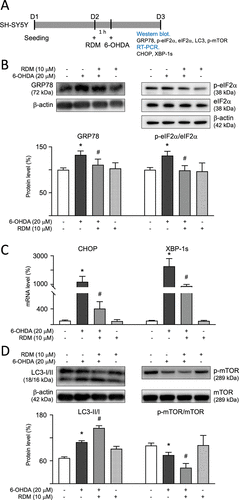 Fig. 3 Modulation of ER stress and autophagy signaling in 6-OHDA-treated SH-SY5Y cells. (A) Experimental flowchart. On day 1, cells were plated. On day 2, after a 1 h pretreatment with RDM, cells were subjected to 6-OHDA-induced neurotoxicity for 16 h. GRP78, p-eIF2α, LC3-I/II, and phosphorylated and nonphosphorylated mTOR were detected using Western blot, while the mRNA levels of CHOP and XBP-1s were measured using RT-PCR. Protein levels of (B) GRP78, p-eIF2α (S51)/eIF2α; (D) LC3-I/II, p-mTOR (S2448); and mTOR were analyzed using β-actin as the internal control. mRNA levels of (C) CHOP and XBP-1s were analyzed using GAPDH as the internal control. The relative protein expression level of control cells is presented as 100% for normalization. *p < 0.05 compared with the control group; #p < 0.05 compared with the 6-OHDA alone group. ER, endoplasmic reticulum; 6-OHDA, 6-hydroxydopamine; RDM, rhodoptilometrin; GADPH, glyceraldehyde-3-phosphate dehydrogenase; CHOP, C/EBP homologous protein; and mTOR, mechanistic target of rapamycin.