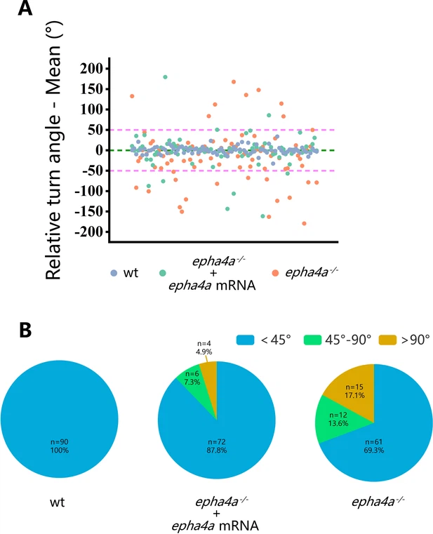 Fig. 3 - Supplemental 1 Rescue of the epha4a homozygous mutant phenotype by epha4a mRNA injection. (A) Scatter plot showing the relative turning angle of wild-type, epha4a homozygous larvae and homozygous larvae injected with the corresponding mRNA. (B) The pie chart shows the proportional distribution of relative turning angles in three groups of larvae. N=30 larvae, n=90 experiments. Larvae that remained stationary during the recording were excluded.