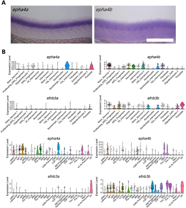 Fig. 7 - Supplemental 1 Expression pattern of epha4 and efnb3 in the spinal cord. (A) Whole-mount in situ hybridization results showing the expression of epha4a and epha4b genes in the spinal cord in 24 days post-fertilization (dpf) zebrafish larvae. (B) Violin plot showing epha4a, epha4b, efnb3a, and efnb3b gene expression in different cell types. Single-cell transcriptome data were acquired from two different studies (top and bottom) (Cavone et al., 2021; Scott et al., 2021). Scale bars: 200 µm in panel (A).