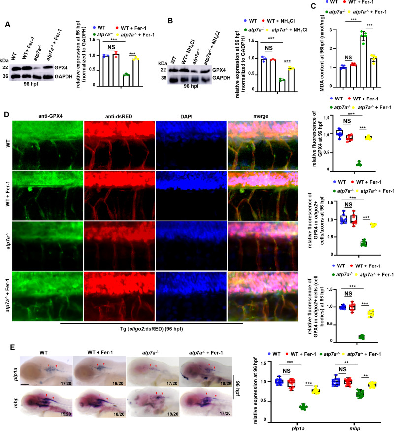Fig. 4 Alleviating ferroptosis can effectively restore GPX4 expression and CNS myelin and axon developmental defects in atp7a−/− larvae. (A) The relative protein level of GPX4 in WT and atp7a−/− embryos treated with or without Fer-1 at 96 hpf, with GADPH as an internal control (graphs). (B) WB analysis of the relative protein level of GPX4 in WT and atp7a−/− embryos treated with or without NH4Cl at 96 hpf, with GADPH as an internal control (graphs). (C) MDA content in WT and atp7a−/− embryos treated with or without Fer-1 at 96 hpf. Each dot represents one repeat. The calculation assay is followed for the next MDA content data. (D) Staining of oligo2+ cells (RED) with GPX4 (GFP) in WT or atp7a−/− larvae from groups with or without Fer-1 treatment at 96 hpf, and the calculation of the relative fluorescence level of GPX4 (up) and GPX4 fluorescence intensity in oligo2+ cell axons (middle) and GPX4 fluorescence intensity in oligo2+ cell bodies (down) (box and whisker plots). (E) Transcriptional expressions of CNS myelin genes mbp and plp1a in WT or atp7a−/− larvae from groups with or without Fer-1 treatment at 96 hpf, and the calculation of the relative expressions of mbp and plp1a (box and whisker plots) at 96 hpf. E, lateral view, anterior to the left.Scale bar: 50 μm (D), 100 μm (E). *P < 0.05, **P < 0.01, ***P < 0.001. NS, not significant. (For interpretation of the references to colour in this figure legend, the reader is referred to the web version of this article.)
