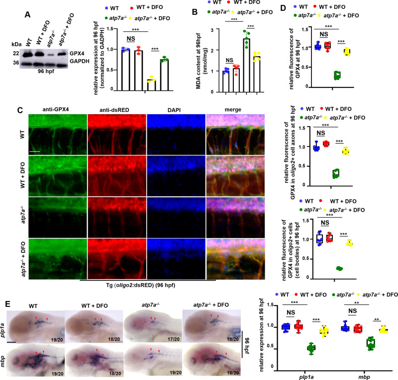 Fig. 5 Iron chelator DFO can effectively restore GPX4 expression and myelin and axon developmental defects in atp7a−/−. (A) The relative protein level of GPX4 in WT and atp7a−/− larvae treated with or without DFO at 96 hpf, with GADPH as an internal control (graphs). (B) MDA content in WT and atp7a−/− larvae treated with or without DFO at 96 hpf. (C) Double staining of oligo2+ cells (RED) with GPX4 (GFP) in WT or atp7a−/− larvae from groups with or without DFO treatment at 96 hpf. (D) The calculation of the relative fluorescence level of GPX4 (up), GPX4 fluorescence intensity in oligo2+ cell axons (middle), and GPX4 fluorescence intensity in oligo2+ cell bodies (down) (box and whisker plots). (E) Transcriptional expressions of CNS myelin genes mbp and plp1a in WT or atp7a−/− larvae from groups with or without DFO treatment at 96 hpf, and the calculation of the relative expressions of mbp and plp1a (box and whisker plots) at 96 hpf. E, lateral view, anterior to the left. Scale bar: 50 μm (C), 100 μm (E). *P < 0.05, **P < 0.01, ***P < 0.001. NS, not significant. (For interpretation of the references to colour in this figure legend, the reader is referred to the web version of this article.)