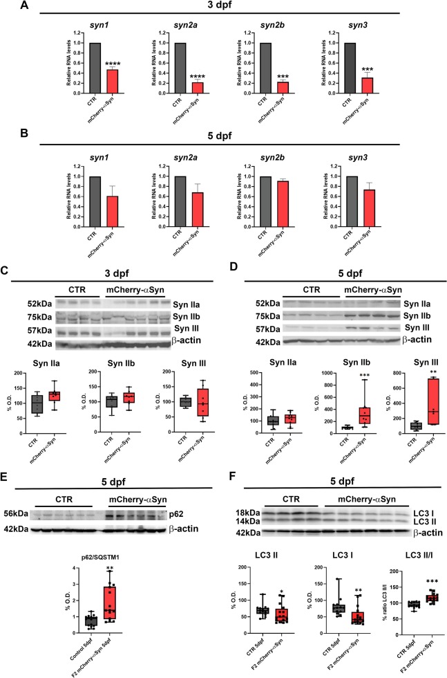 Fig. 6 mCherry-αSyn expression affects Synapsins, p62 and LC3 levels. (A-B) mRNA expression of zebrafish synapsins at 3 and 5 dpf for control and F2 mCherry positive 20 larvae pools, relative expression was calculated with the ΔΔCt method using rpl13a as housekeeping gene: (A) at 3 dpf all synapsins are downregulated in the mCherry-αSyn larvae compared to age-matched controls (Unpaired t-test, p < 0.0001, ****, p = 0.0005, ***). (B) At 5 dpf a not significant reduction in the mRNA levels of the four synapsins genes is still present in the transgenic larvae compared to the wild-type-like controls (Unpaired t-test). (C) Western blot analysis of synapsin IIa, IIb and III protein levels at 3 dpf from 20 larvae pools of F2 mCherry-αSyn and controls: SynIIb and SynIII levels had a slight but non-significant increase in the transgenic larvae pools. Boxplots represent the distribution of 75 %, 50 %, and 25 % of the values (Mann-Whitney U test, N = 3, n = 3, 20 larvae pools). (D) Western Blot on transgenic and control larvae pools at 5 dpf showed a significant increase of Syn IIb and Syn III protein levels in the F2 mCherry-αSyn samples compared to controls (Mann-Whitney test, ** p = 0.0068, *** p = 0.0003). Boxplots represent the distribution of 75 %, 50 %, and 25 % of the values, with experiments done in triplicate, n = 5 (20 larvae pools) for each condition, samples loaded in double. (E) Western blot for p62/SQSTM1 on F2 mCherry-αSyn and wild-type-like controls at 5 dpf showed a significant increase of p62 levels in transgenic pools compared to the controls (Mann-Whitney test, ** p = 0.0018). Boxplots represent the distribution of 75 %, 50 %, and 25 % of the values, with experiments done in triplicate, n = 7 (20 larvae pools) for each condition, samples loaded in double. (F) Western blot for LC3 on F2 mCherry-αSyn and wild-type-like controls at 5 dpf, where LC3 I and II levels are significantly reduced (Mann-Whitney test, * p = 0.0499, ** p = 0.0035), while LC3 II/I ratio is higher (Mann-Whitney test, *** p < 0.0001) in transgenic larvae pools compared to controls. Boxplots represent the distribution of 75 %, 50 %, and 25 % of the values, with experiments done in triplicate, n = 5 (20 larvae pools) for each condition, samples loaded in double (C, D, E, F). Graph shows relative densitometric quantification to β-actin.