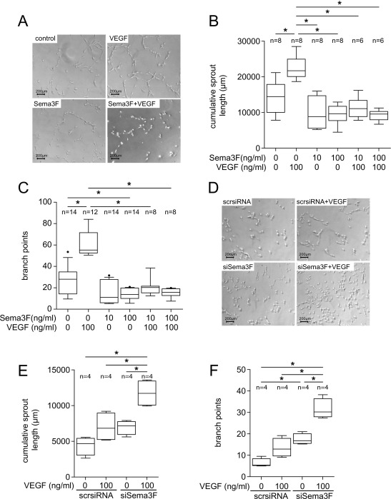 Fig. 4 Sema3F is an inhibitor of angiogenesis in Matrigel® sprouting assays. (A-C) In cardiac endothelial cells (HCECs) Sema3F abolished the pro-angiogenic effect of VEGF. HCECs were cultured with the indicated amounts of Sema3F or VEGF alone or in combination over 16 to 18 h. HCECs were then assayed on Matrigel® for further 2.5 h. (A) Representative micrographs of stimulated HCECs are shown. (B&C) Sema3F prevented VEGF-induced cumulative sprout length (B) and branching of HCECs (C). Data from 4 independent experiments were shown (n, number of biological replicates). The results were analyzed using the one-way ANOVA and Bonferroni's multiple comparisons test: *p < 0.05. Figs. Dsingle bondF show the effect of Sema3F knockdown on angiogenesis of HCECs. The siRNA-based Sema3F knockdown resulted in a potentiated pro-angiogenic effect of VEGF. HCECs transfected with Sema3F-specific siRNA (siSema3F) or control siRNA (ctrl-siRNA) were treated with 100 ng/ml VEGF or EBM with 2 % FCS for 18 h before being assayed on Matrigel®. (D) Representative micrographs are shown. Sema3F knockdown led to a significant increase in cumulative sprout length (E) and number of branch points (F). (E&F) Data from 4 independent experiments were shown (n, number of biological replicates). All box plots extend from the 25th to the 75th percentile with the median marked. Whiskers extend from the 10th to the 90th percentile. The results were analyzed using one-way ANOVA followed by Bonferroni's multiple comparison test: *p < 0.05.