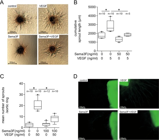 Fig. 5 Sema3F inhibits angiogenesis in spheroid sprouting and aortic ring assay. (A&B) For the Spheroid sprouting assay, HCECs were formed to spheroids and were then stimulated for 24 h with the indicated amounts of Sema3F, VEGF or both. (A) Representative micrographs are shown. (B) Sema3F caused a significant decrease in sprout length and reduced the proangiogenic effect of VEGF. Data from 4 independent experiments are shown. Ten spheroids per well per condition were measured and the average cumulative sprout length was estimated (n, number of biological replicates). Analysis with one-way ANOVA followed by Bonferroni's multiple comparisons test. *p < 0.05. (C&D) In the aortic ring assay, aortic rings were stimulated with the indicated amounts of Sema3F, VEGF or both on days 3, 5 and 7. The number of capillaries was counted on day 9. (C) Compared to controls, VEGF alone increased sprouting, while co-treatment of aortic rings with Sema3F prevented VEGF-induced sprouting ex vivo. Data from 3 independent experiments, total of 10–12 aortic rings per group (n, number of biological replicates). All box plots extend from the 25th to the 75th percentile with the median marked. Whiskers extend from the 10th to the 90th percentile. The results were analyzed using one-way ANOVA followed by Bonferroni's multiple comparisons test. *p < 0.05.