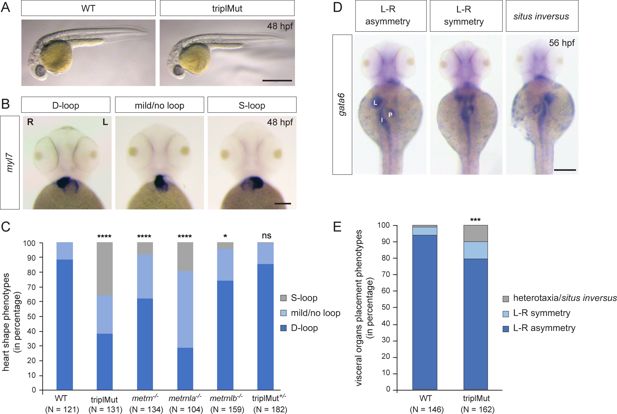 Fig. 1 Metrns loss-of-function causes heart jogging/looping and visceral organ positioning defects. (A) 48 hpf triplMut zebrafish display no gross phenotypic defects compared to wild type (WT) embryos. (B) Examples of 48 hpf embryos showing mRNA expression of the heart marker myl7 and the different heart looping phenotypes (ventral view). (C) Quantification in percentage of heart looping phenotypes at 48 hpf in WT, triplMut, metrn-/-, metrnla-/-, metrnlb-/-, triplMut+/- embryos; displayed p-values compared to WT: ****p-value:<1.0e-5 for triplMut, ****p-value:<1.0e-5 for metrn-/-, ****p-value:<1.0e-5 for metrnla-/-, *p-value: 0.003 for metrnlb-/-, ns p-value: 0.49 for triplMut+/-, p-value compared to metrnlb-/-: *p-value: 0.034 for triplMut+/- (not displayed). (D) Example of 56 hpf embryos showing gata6 mRNA expression highlighting the different visceral organ positioning phenotypes (ventral view). (E) Quantification in percentage of visceral organ positioning phenotypes at 56 hpf in WT and triplMut embryos, ***p-value: 0.00034. In (B) L=left, R=right. In (D) L=liver, P=pancreas, I=intestine. Scale bars in (A): 3mm, (B): 100 μm, (D): 500 μm.