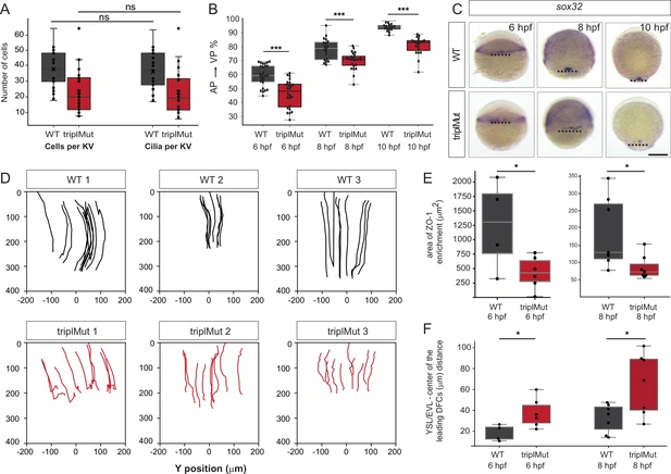 Fig. 5 - Supplemental 1 Metrns loss-of-function leads to DFC disorganization and migration defects. (A) The KV cilia number and cells per KV quantification in WT and triplMut embryos at 14 hpf show no significant difference between cilia number and KV cells (N WT: 23, N triplMut: 26, Student T-tests, n.s.: 0.67 for WT KV cells, 0.96 for triplMut KV cells). Error bars indicate standard deviation. (B) DFC migration quantification calculated as the percentage of the total embryo length at 6, 8, and 10 hpf in wild type (WT) vs. triplMut embryos. Per condition and group, 16–27 embryos were analyzed (Fisher exact test, ***p-value: 2.5e-06 for 6 hpf, ***p-value: 0.00038 for 8 hpf and ***p-value: 1.1e-08 for 10 hpf). Error bars indicate standard deviation. (C) Sox32 antisense riboprobe in situ hybridization highlighting DFC migration between 6 hpf and 10 hpf in WT and triplMut embryos (point line marks the margin of epiboly). All depicted images are dorsal views. (D) Single traces of in vivo tacked DFCs in WT control (upper panel) and triplMut (lower panel) showing the vegetal movement and convergence. (E) Quantification at 6 hpf (left plot) and 8 hpf (right plot) of DFC adjacent ZO-1 enrichment areas reveals a decrease in triplMut embryos in contrast to respective WT controls (T-test; 6 hpf *p-value: 0.043, 8 hpf *p-value: 0.028). Error bars indicate standard deviation. (F) The distance of the leading DFCs to the EVL is increased in triplMut compared to WT controls visualized at 6 hpf and 8 hpf (nested T-test, *p-value: 0.039 N=4 WT, 30 DFCs measured, triplMut N=6, 46 DFCs measured; for 6 hpf and *p-value: 0.021 N=7 WT embryos, 47 DFCs measured, N=7 triplMut, 54 DFCs measured for 8 hpf). Error bars indicate standard deviation. Scale bars: in (C) 0.25 mm.