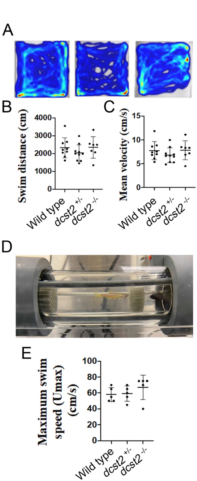 Fig. 1 Genomic structure of zebrafish dcst2 and the CRISPR gRNA target site used to generate a knockout mutant. Zebrafish dcst2 contains 16 exons and is located on chromosome sixteen. Blue exons denote translated exons and white exons are the Untranslated Regions (UTR). A frame shift mutation in exon 3 was identified in a founder mutant line resulting in premature stop codons. Yellow highlighted nucleotides indicate the PAM sequence and red highlighted nucleotides indicate the guide RNA target sequence. Genotypic ratios generated from crosses between two dcst2+/− mutant zebrafish depicted as a pie chart (B). Transcriptional expression levels of dcst2 relative to actin in the testis confirmed that our mutation likely is being degraded by nonsense-mediated decay (C). Asterisks represent a statistically significant difference (p < 0.05). D, A comparison between muscle and testis dcst2 expression indicating that dcts2 is not expressed in muscle. Asterisks represent a statistically significant difference (p < 0.05). E, Tabulation of male body weight of each fish from each genotype. Asterisks represent a statistically significant difference (p < 0.05). However, this finding was slightly underpowered with the power of the performed test being 0.701 with alpha (α) value set at 0.05