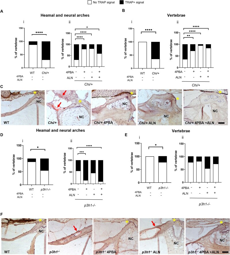 Analysis of osteoclast activity in Chi/+ and p3h1−/− zebrafish. (A, B) TRAP staining quantification on haemal and neural arches and autocentrum of WT and Chi/+ (i) and Chi/+ untreated and treated with 4PBA, ALN, and 4PBA + ALN (ii). (C) Representative images of TRAP-stained WT and Chi/+ caudal vertebrae. (D, E) TRAP staining quantification on arches and vertebrae of WT and p3h1−/− (i) and p3h1−/− untreated and treated with 4PBA, ALN, and 4PBA + ALN (ii). (F) Representative images of TRAP-stained WT and p3h1−/− caudal vertebrae. Red arrows indicate TRAP signal on vertebral bodies. The yellow asterisks indicate the intervertebral disc. Scale bar: 50 μm. In the graphs, the percentage of TRAP+ vertebrae on total number of analyzed vertebrae is reported. *p < .05, **p < .01, ***p < .001, ****p < .0001. Abbreviations: ALN, alendronate; NC, notochord; TRAP, tartrate-resistant acid phosphatase; 4PBA, 4-phenylbutyrate.