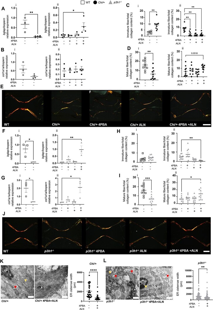 Analysis of osteoblast homeostasis and extracellular collagen maturation. (A) RT-qPCR analysis of bglap expression in WT, Chi/+ (i), and untreated and treated Chi/+ (ii). (B) RT-qPCR analysis of col1a1a expression in WT, Chi/+, and untreated and treated Chi/+. (C, D) Quantification of the immature (green-yellow) or mature (red) collagen fibers on total collagen content in WT, Chi/+ (i) and untreated and treated Chi/+ (ii) caudal vertebrae. (E) Representative images of picrosirius red–stained caudal vertebrae sections of WT and untreated or treated Chi/+. Scale bar: 100 μm. (F) RT-qPCR analysis of bglap expression in WT, p3h1−/− (i), and untreated and treated p3h1−/− (ii). (G) RT-qPCR analysis of col1a1a expression in WT, p3h1−/− (i), and untreated and treated p3h1−/− (ii). (H, I) Quantification of the immature (green-yellow) or mature (red) collagen fibers on total collagen content in WT, p3h1−/− (i), and untreated and treated p3h1−/− caudal vertebrae (ii). (J) Representative images of picrosirius red–stained caudal vertebrae sections of WT and untreated and treated p3h1−/−. Scale bar: 100 μm. (K) Transmission electron microscopy representative images of Chi/+ osteoblasts and quantification of ER cisternae width in Chi/+ and Chi/+ treated with 4PBA + ALN. Scale bar = 500 nm. (L) Transmission electron microscopy representative images of p3h1−/− osteoblasts and quantification of ER cisternae width in p3h1−/− and p3h1−/− treated with 4PBA + ALN. Scale bar = 500 nm. (Red arrowheads indicate ER cisternae transverse sections, yellow arrowheads indicate ER cisternae sagittal sections, pink asterisks indicate osteoblasts nuclei.). *p < .05, **p < .01, ***p < .001, ****p < .0001. Abbreviations: ALN, alendronate; ER, endoplasmic reticulum; RT-qPCR, reverse transcriptase quantitative PCR; 4PBA, 4-phenylbutyrate.