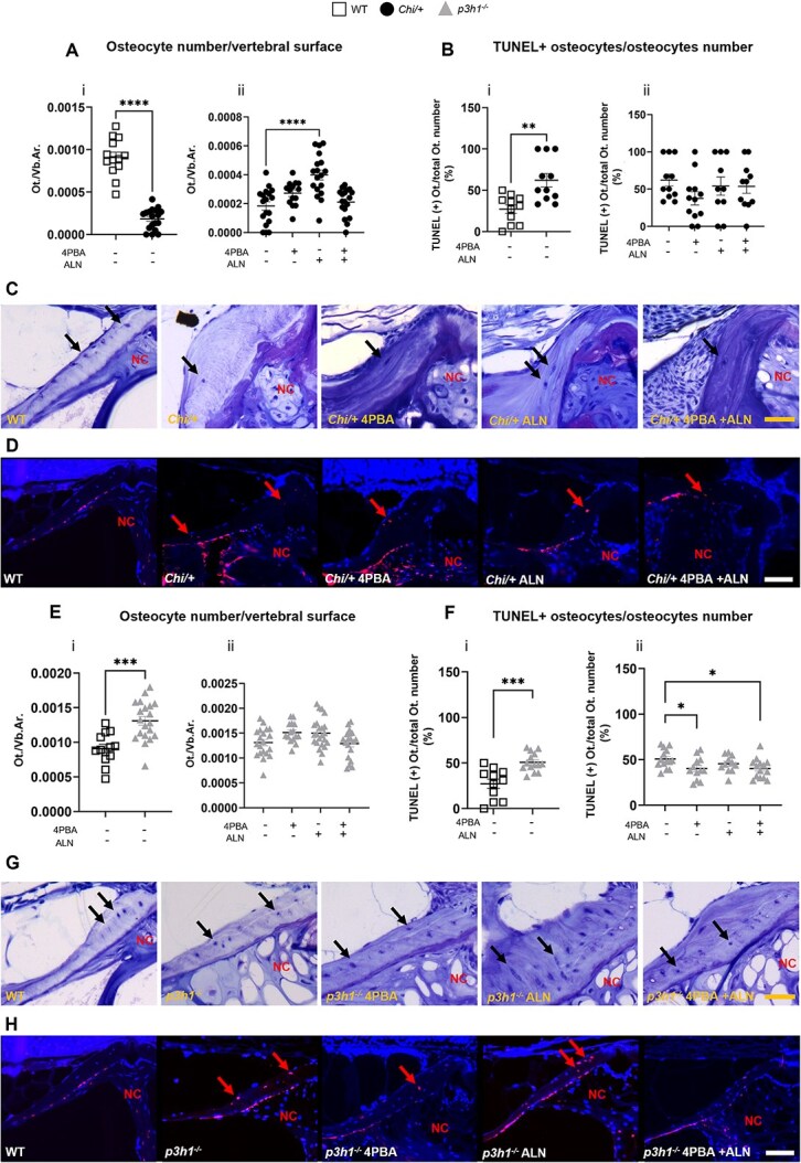 Analysis of osteocyte number and viability in Chi/+ and p3h1−/−. (A) Osteocyte number normalized to vertebral area (Ot./vb.Ar.) performed on toluidine blue sections of WT, Chi/+ (i), and untreated and treated Chi/+ (ii). (B) TUNEL+ osteocytes on total osteocytes number (TUNEL(+) Ot./ total Ot. number) in WT, Chi/+ (i), and untreated and treated Chi/+ (ii). (C) Representative images of toluidine blue–stained vertebrae showing osteocytes (black arrows) in WT and untreated or treated Chi/+. Scale bar: 50 μm. (D) Representative images of TUNEL assay performed on WT and treated and untreated Chi/+ vertebrae. Red arrows indicate apoptotic osteocytes; nuclei are stained with DAPI (4′,6-diamidino-2-phenylindole). Scale bar: 100 μm. (E) Osteocyte number on vertebral area (Ot./vb.Ar.) performed on toluidine blue–stained sections of WT, p3h1−/− (i), and untreated and treated p3h1−/ (ii). (F) TUNEL+ osteocytes on total osteocyte number (TUNEL(+) Ot./ total Ot. Number) in WT p3h1−/− (i) and untreated and treated p3h1−/− (ii). (G) Representative images of toluidine blue–stained vertebrae showing osteocytes (black arrows) in WT and untreated or treated p3h1−/−. Scale bar: 50 μm. (H) Representative images of TUNEL assay performed on WT and treated and untreated p3h1−/− vertebrae. Red arrows indicate apoptotic osteocytes; nuclei are stained with DAPI. Scale bar: 100 μm. In the graphs, each dot represents a single value. *p < .05, **p < .01, ***p < .001, ****p < .0001. Abbreviations: ALN, alendronate; NC, notochord; 4PBA, 4-phenylbutyrate.