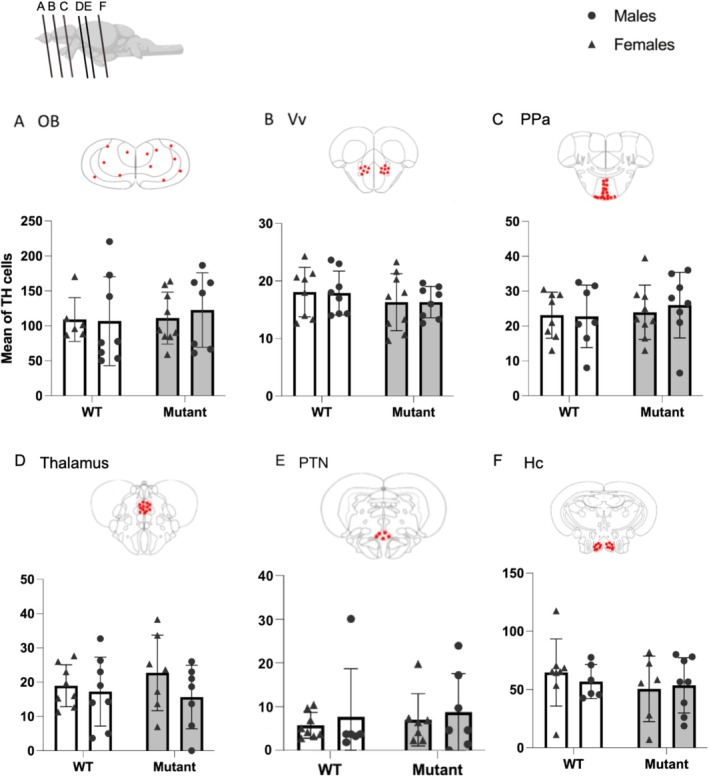 Quantification of TH‐positive cells in WT and mutant fish. (A) Olfactory bulbs (OB). (B) Ventral nucleus of ventral telencephalic area (Vv). (C) Parvocellular preoptic nucleus (PPa). (D) Thalamus. (E) Posterior tuberal nucleus (PTN). (F) Caudal zone of periventricular hypothalamus (Hc). Red plots represent regions of interest in which TH‐positive cells have been quantified. Mean ± SEM; the number of analyzed brains is indicated in each bar.