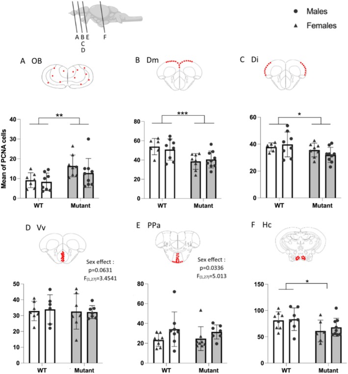 Quantification of the number of PCNA‐labeled cells in WT and mutant fish. (A) Olfactory bulbs (OB). (B) Medial zone of dorsal telencephalic area (Dm). (C) Lateral zone of dorsal telencephalic area (Di). (D) Ventral nucleus of ventral telencephalic area (Vv). (E) Parvocellular preoptic nucleus (PPa). (F) Caudal zone of periventricular hypothalamus (Hc). Red dots on schematic frontal sections indicate quantified areas. Mean ± SEM, *