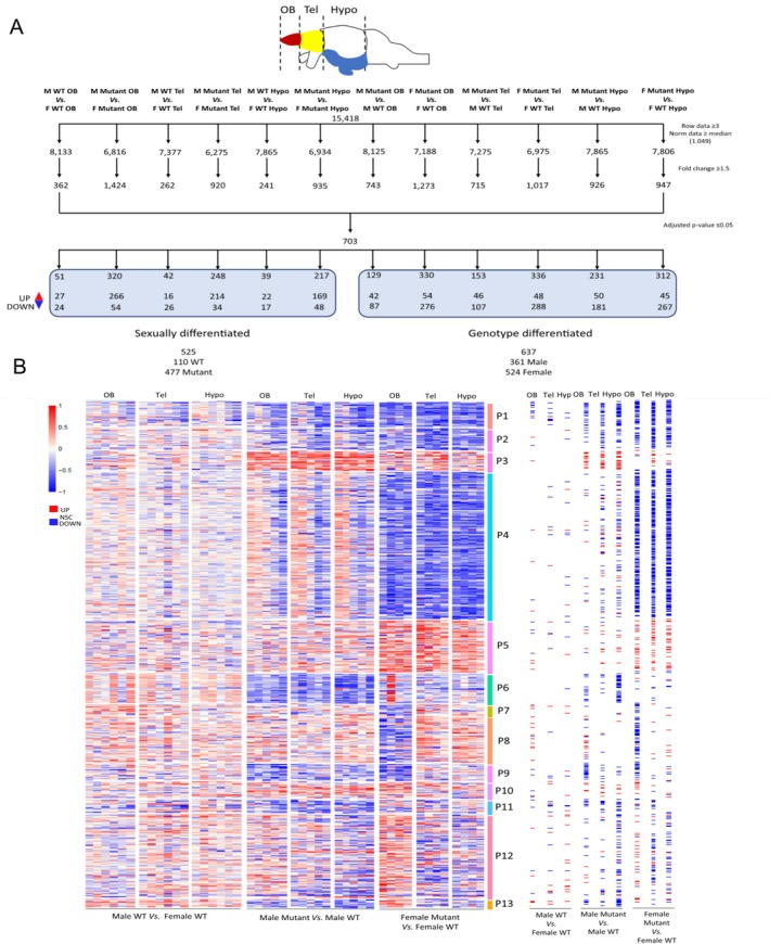 Workflow for BRB‐Seq data processing and heatmap of differentially expressed genes (DEGs) in the three different parts of the brain (olfactory bulb, telencephalon, and hypothalamus) on male and female WT and mutant adult fish. (A) Filtration steps based on limit of detection, fold change cut‐off of 1.5, and statistics leading to 703 DEGs. Hypo, hypothalamus; OB, olfactory bulb; Tel, telencephalon. (B) Heatmap of all DEGs in each WT and mutant fish in the three areas of the brain. Genes are clustered in 13 distinct patterns: P1. 36 DEGs, P2. 31 DEGs, P3. 27 DEGs, P4. 213 DEGs, P5. 74 DEGs, P6. 43 DEGs, P7. 15 DEGs, P8. 66 DEGs, P9. 24 DEGs, P10. 23 DEGs, P11. 19 DEGs, P12. 120 DEGs, P13. 12 DEGs. On the right‐hand side of the heatmap, each dysregulated gene is represented as a tile, with a color intensity reflecting the average log2 fold change of samples for each comparison and brain region. Scale: Log2 fold change. Red = significantly upregulated expression, Blue = significantly downregulated expression, White = no significant change. Male: N = 6 WT and 5 mutants; Female: N = 6 WT and 4 mutants.