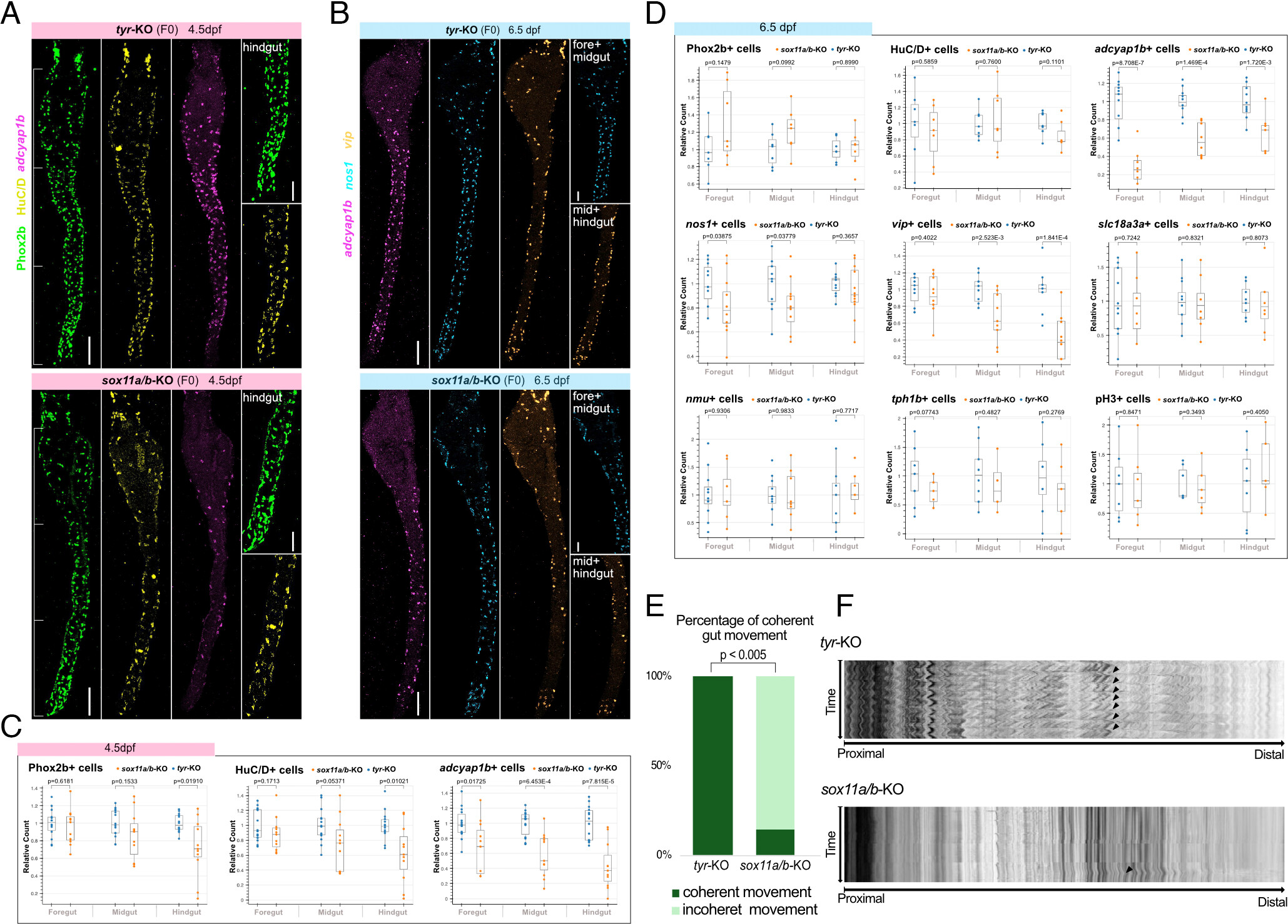 Fig. 3 Quantification analysis reveals differences between sox11a/b knock-out and control embryos. All staining images were after “Max Intensity” z-stack projection. (A) Antibody and HCR staining comparing the expression levels of Phox2b, HuC/D, and adcyap1b in sox11a/b knock-out embryos (Top) with the control embryos (Bottom) at 4.5 dpf. On the right, hindgut regions that showed a significant difference in cells expressing Phox2b and HuC/D were zoomed in. A significant difference in adcyap1b expression was observed throughout the whole gut. (Scale bar, 100 μm, and 50 μm for zoomed region.) (B) Antibody and HCR staining comparing the expression levels of adcyap1b, nos1, and vip in sox11a/b knock-out embryos with the control embryos at 6.5 dpf. On the right, corresponding regions that showed a significant difference in cells expressing nos1 and vip were zoomed in. A significant difference in adcyap1b expression was observed throughout the whole gut. (Scale bar, 100 μm, and 50 μm for zoomed region.) (C) At 4.5 dpf, an overall developmental delay was observed in sox11a/b knock-out embryos (Nsox11a/b = 11, Ntyr = 14, replicates = 3). (D) At 6.5 dpf, a specific reduction of the inhibitory motor neuron cluster was observed in sox11a/b knock-out embryos, particularly in adcyap1b expression (for Phox2b and HuC/D, Nsox11a/b = 7, Ntyr = 7, replicates = 3; For other neuronal markers, Nsox11a/b = 8, Ntyr = 12, replicates = 3). (E) A significant increase of incoherent gut movement was found in sox11a/b knock-out embryos. (Nsox11a/b = 7, Ntyr = 8). (F) Kymographs showing the passage of coherent contraction from proximal to distal in tyr knock-out embryos, and little movement at the length of the gut in sox11a/b knock-out embryos. Arrows indicate gut contraction.