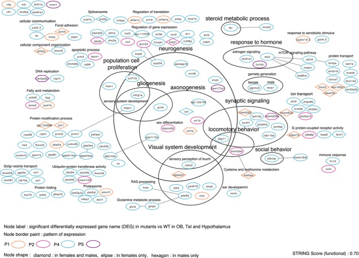 Functional interaction and annotation of genes from patterns (Figure 7B) P1, P2, P4, and P5 (indicated by the node border color) are significantly differentially expressed in mutants versus WT in the three brain areas, in males and/or in females (indicated by the node shape).