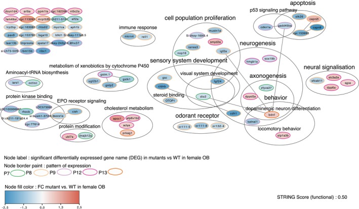 Cytoscape network visualization: Functional interaction (STRING functional score: 0.50) and annotation of genes from pattern of expression (described in Figure 7B and indicated by the node border color) P7, P8, P9, P12, and P13 (indicated by the node border color), significantly differentially expressed in female mutant versus WT, in the olfactory bulbs (OB).
