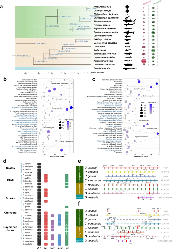 Fig. 2 Phylogeny and comparative genomics of cartilaginous fishes. a Phylogenetic and gene family expansion and contraction analysis of O. kenojei and P. glauca. b, c KEGG pathway enrichment analysis of expanded genes in O. kenojei (b) and P. glauca (c). Top 40 enriched pathways are shown; the pathways labeled in blue are shared by both species. d Orthology catalog for opsins in cartilaginous fishes. The numbers in the boxes are paralog numbers; the dashed box represents a pseudogene. e, f Loss of sws1 (e) and sws2 (f) in cartilaginous fishes, respectively. Synteny of genes around sws1 and sws2 is illustrated using gray bands connecting the orthologs across species (The dashed lines indicate that these two genes are not adjacent on the scaffold or chromosome).