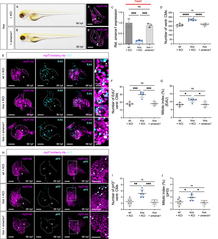 Restoration of smarce1 mRNA suppresses excessive CM proliferation. (A,B) Lateral view of hos mutant embryos injected with KCl (control) or wt zebrafish smarce1 mRNA at 96 hpf. (A′,B′) Confocal images of hos (myl7:mcherry.nls) with KCl or smarce1 mRNA injection at 96 hpf (scale bar: 50 µm). (C) Relative smarce1 mRNA expression in the hearts of wt or hos embryos with KCl or smarce1 mRNA injection at 96 hpf (n = 3). (D) Number of ventricular CMs in wt or hos mutants with injection of KCl or smarce1 mRNA at 96 hpf. (E) Confocal images of EdU-incorporated hearts dissected from Tg (myl7:mCherry.nls) or hos (myl7:mCherry.nls) with KCl or smarce1 mRNA injection (scale bar: 50 µm). (F,G) Statistical analyses of the EdU assay (EdU+ ventricular CMs and the mitotic index) in KCl- or smarce1 mRNA-injected wt and hos (n = 5). Injection of smarce1 mRNA rescues cardiac hyperplasia of hos. (H) Confocal images of dissected hearts from wt or hos crossing with Tg (myl7:mcherry.nls) after KCl or smarce1 mRNA injection (scale bar: 50 µm). IF staining of pH3 visualizes proliferating cells in the hearts of MO-injected embryos at 96 hpf. (I,J) Quantification of pH3+ CMs and the mitotic index showing attenuated ventricular CM proliferation in hos by smarce1 mRNA injection at 96 hpf (n = 5). v, ventricle; a, atrium; ventr., ventricular.