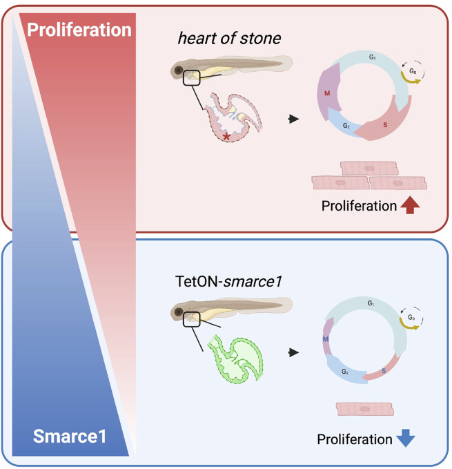 Schematic illustration showing the regulatory role of smarce1 in CM proliferation of embryonic zebrafish heart. Smarce1 negatively regulates CM proliferation in the embryonic zebrafish heart as its loss (