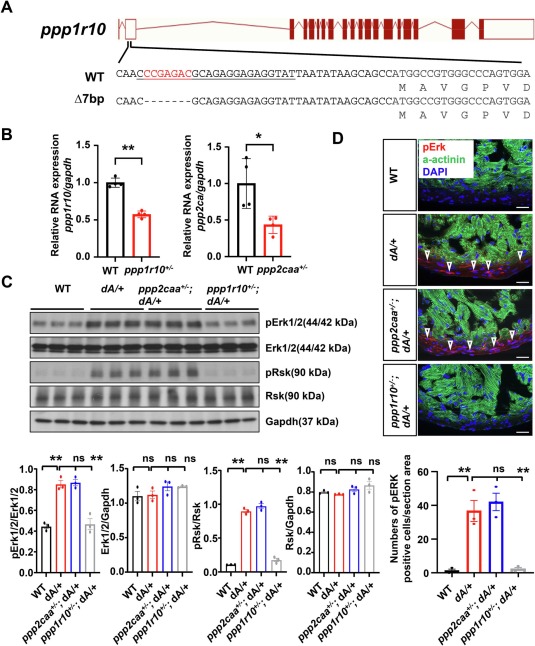 Fig. 4 ppp1r10 inhibition rescues aberrantly activated Erk signaling in dA/+. (A) Schematics of ppp1r105’UTR generated by MMEJ sgRNA. The underlined sequence indicates sgRNA sequence, red indicates deleted nucleotides. (B) Evaluation of ppp1r10 and ppp2caa gene transcripts expression by quantitative RT-PCR in hearts from heterozygous ppp1r10+/− and ppp2ca+/− adult zebrafish at 3 months old. n = 4. t-test was used to compare 2 groups. Data are presented as mean ± SEM, *p < 0.05, **p < 0.01. (C) Representative western blots of protein Erk, pErk, Rsk, pRsk and Gapdh from 3 months old zebrafish hearts and quantification of Erk, pErk, Rsk, and pRsk. One-way ANOVA was used to compare multiple groups for each mutation. Data are presented as mean ± SEM, three biological replicates, **p < 0.01. WT, wild type, ns, non-significant. (D) Representative images and quantification of pErk in cryosectioned heart tissues of WT, dA/+, ppp2caa+/−; dA/+ and ppp1r10+/−; dA/+ zebrafish mutants co-immunostained using anti-pErk antibody and anti-α-actinin antibody. α-actinin, green. pErk, red. DAPI, blue. The open arrowheads indicate pErk. pErk, phosphorylated Erk1/2. Scale bars: 20 μm. One-way ANOVA was used to compare multiple groups for each mutation. Data are presented as mean ± SEM, three biological replicates, **p < 0.01. WT, wild type, ns, non-significant. (For interpretation of the references to colour in this figure legend, the reader is referred to the web version of this article.)