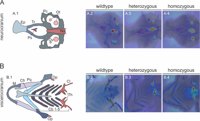 Correlation of AI analyzed structures by attention rollout visualizations overlaid on the original microscopic images. (A.1 & B.1) Annotated illustrations on the left side indicated key structures of the (