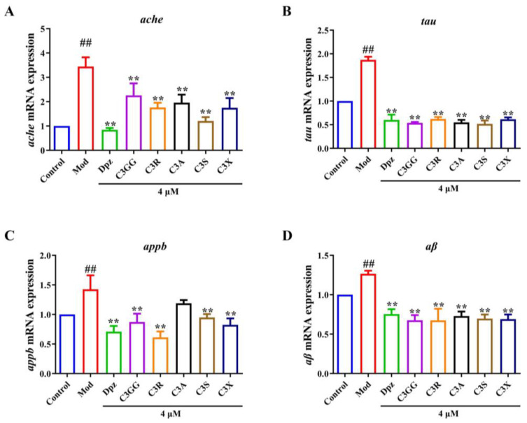 The effects of cyanidin derivatives on the transcriptional alterations of AD-related genes of AD zebrafish. (A) Relative mRNA expression of ache. (B) Relative mRNA expression of tau. (C) Relative mRNA expression of appb. (D) Relative mRNA expression of aβ. ## p < 0.01 vs. Con group, ** p < 0.01 vs. model group. Group notes: Control: control group, Mod: model group (AlCl3), Dpz: donepezil + AlCl3 group, C3GG: cyanidin-3-O-(trans-p-coumaroyl)-diglycoside + AlCl3 group, C3R: cyanidin-3-O-rutinoside + AlCl3 group, C3A: cyanidin-3-O-arabinoside + AlCl3 group, C3S: cyanidin-3-O-sophoroside, + AlCl3 group, C3X: cyanidin-3-O-xyloside+ AlCl3 group.