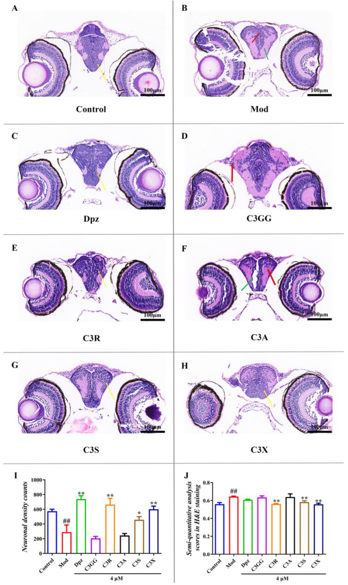 Comparison of histopathological alterations in brain tissues among various treatment groups. (A) Normal histological section of larval brain (40×). (B) Larvae brain exposed to 80 μM AlCl3 (40×). (C) Larvae brain exposed to AlCl3 + 4μM Dpz (40×). (D) Larvae brain exposed to AlCl3 + 4μM C3GG (40×). (E) Larvae brain exposed to AlCl3 + 4μM C3R (40×). (F) Larvae brain exposed to AlCl3 + 4μM C3A (40×). (G) Larvae brain exposed to AlCl3 + 4μM C3S (40×). (H) Larvae brain exposed to AlCl3 + 4μM C3X (40×). (I) Neuronal density in zebrafish brain. (J) semi-quantitative analysis scores in H&E staining. ## p < 0.01 vs. Con group, * p < 0.05 and ** p < 0.01 vs. model group. (The neurons are highlighted by yellow arrows. Red arrows indicate a small population of neurons exhibiting pyknosis and deeply stained necrosis, whereas green arrows point to areas of midbrain dilation accompanied by balloon-like degeneration).