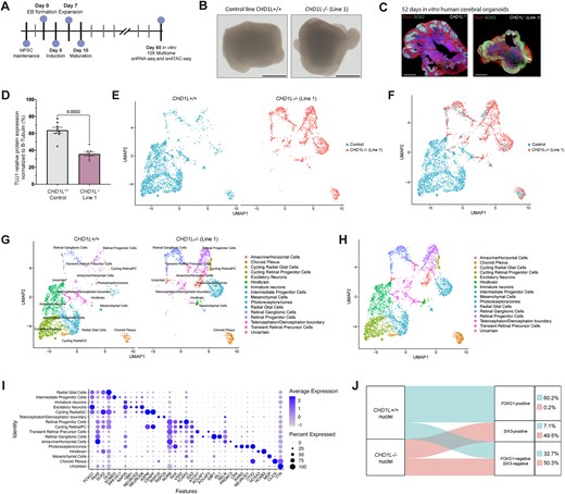 Fig. 7 Loss of CHD1L perturbs forebrain cell-fate determination in hCO. (A) Schematic of hCO generation from hiPSC. (B) Pictures of 60 DIV hCO derived from CHD1L+/+ and the two CHD1L−/− cell lines. Scale bars: 1 mm. (C) Immunostaining against TUJ1 (neuronal cytoskeleton marker) and SOX2 (neural progenitor cells) on 52 DIV hCO either CHD1L−/− (Mutant Line 1) or control. Scale bars: 500 μm. (D) Semi-quantitative analysis of TUJ1 protein expression in CHD1L−/− (Mutant Line 1) and control hCO normalized with β-Tubulin. Data shown as mean ± SEM of 8 hCO per condition; representative of N = 2 batches of generated organoids; Student’s t-test. (E) Uniform Manifold Approximation and Projection (UMAP) projection of CHD1L+/+ and CHD1L−/- hCO cells colored by condition. N = 6 organoids per condition, 2385 cells CHD1L+/+ and 1634 cells CHD1L−/− sequenced. (F) UMAP representation of CHD1L+/+ and CHD1L−/− (Mutant Line 1) multiome analysis combined and integrated on the same graph. N = 12 organoids, 4019 cells. (G) UMAP representation of CHD1L+/+ and CHD1L−/− (Mutant Line 1) hCO multiome analysis on the same graph. Clusters based on cell identities are indicated. (H) UMAP representation of CHD1L+/+ and CHD1L−/− (Mutant Line 1) hCO multiome analysis combined and integrated on the same graph. Clusters based on cell identities are indicated. (I) Dot plot representing key cell type markers and their levels of gene expression within cerebral organoids’ cell clusters. Dot size indicates the proportion of cells per cluster expressing the corresponding gene and color is associated to the average expression level of the corresponding gene per cluster. (J) Sankey diagram visualization of the proportion of nuclei positive for either the ventral telencephalic marker FOXG1, or the eye territory marker SIX3 (normalized expression >1) in CHD1L+/+ and CHD1L−/− hCO. Percentage of nuclei is indicated for each category.
