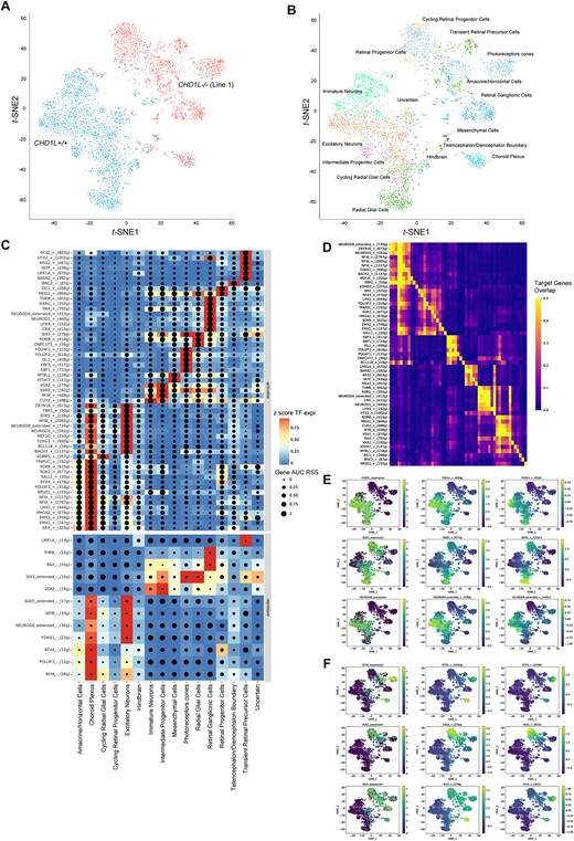 Fig. 8 SCENIC + analysis reveals CHD1L function in forebrain cell-fate determination. (A) t-SNE dimensionality reduction of 4019 cells based on gene and target region enrichment scores of eRegulons. Cells are colored according to their genotypes CHD1L+/+ and CHD1L−/− and were analyzed for gene expression and chromatin accessibility in 60-day in vitro hCO. (B) t-SNE dimensionality reduction of organoid cells based on gene and target region enrichment scores of eRegulons. Cells are colored according to their identity. (C) Heatmap/dot-plot showing transcription factor (TF) expression of the eRegulon on a color scale and cell-type specificity (RSS) of the eRegulon on a size scale. Cell types are ordered on the basis of their gene expression similarity. (D) Overlap of target genes of eRegulons. The overlap is divided by the number of target genes of the eRegulon in each row. (E) Representative t-SNE dimensionality reduction of multiome dataset colored based on TF expression, target gene and region activity of eRegulons for telencephalic markers (FOXG1, SOX2, NEUROD6). (F) Representative t-SNE dimensionality reduction of multiome dataset colored based on TF expression, target gene and region activity of eRegulons for retinal markers (OTX2, VSX2, SIX3). AUC, area under the recovery curve; g, gene; r, region; RSS, eRegulon specificity score; TF, transcription factor.