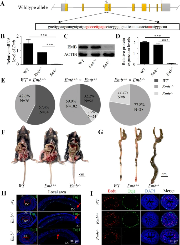 Fig. 2 Loss of Emb causes HSCR-like phenotypes in mice. A, Using CRISPR/Cas9 system, a 13-bp frameshift deletion in exon 3 of Emb was induced. B, Emb mRNA expression is diminished in Emb-/- mice determined by quantitative real-time PCR. C, The EMB protein expression levels in different genotypes were determined by Western blotting, and the expression levels were quantified in (D). E, The percentage of each genotype in three different crossing scenarios. ***, pā<ā0.001, one-way ANOVA with Bonferroni post-hoc, Nā=ā3. F, Abdominal anatomy of wild type, Emb+/- and Emb-/- mice. G, Isolated colorectal from the distal rectum to the ileocecal part, note the dry stool filled and dilated colon of the Emb-/- mice. H, Immunofluorescence staining of 6-week mouse colons; the entire colon is rolled into a donut-like shape along the longitudinal axis, and then embedded and processed into paraffin sections; the right panels are zoom-ins of the distal colon. Green, Tuj1; blue, DAPI. The red arrows indicate the enteric neurons farthest from the proximal colon, and the distance from the"red arrow"to the distal colon represents the aganglionic segment; PC, proximal colon; DC, distal colon; Quantification results are presented in Additional file 2: Fig.S5 G. I, Immunofluorescence staining of the cross sections of 2-day neonatal mouse colons. Red, Brdu; green, Tuj1; blue, DAPI. Quantification results are presented in Additional file 2: Fig.S5 H