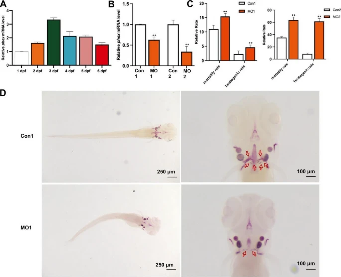 Fig. 4 A Phex expression at different stages post-fertilization in zebrafish (n = 20 embryos per time point, 3 independent experiments). B Validation of Phex expression inhibition efficiency (n = 15 embryos per group, 3 independent experiments). C Statistics depicting mortality and malformation rates at varying concentrations of MO (n = 120 embryos total, pooled from 3 independent experiments with n = 40 per experiment). D Microinjection of zebrafish eggs and observation of tooth development at 6 days post-fertilization (dpf) via Alizarin Red staining (n = 30 embryos per group, 3 independent experiments). Scale bars: 250 μm (embryo images), 100 μm (tooth staining images). Data represent mean ± SEM. Statistical analysis performed using Student’s t-test for pairwise comparisons and one-way ANOVA for multiple group comparisons. *p < 0.05, **p < 0.01, ***p < 0.001 vs. control group