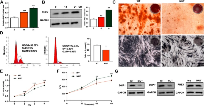 Fig. 5 The qRT-PCR A and Western blot B results demonstrate upregulation of PHEX expression during mineralization induction in DPSCs (qRT-PCR: n = 3 per time point, 4 independent experiments; Western blot: n = 3 per time point, 3 independent experiments). C The results of ARS and ALP staining reveal reduced mineralization capability in mutant cells (ARS: n = 6 per group, 4 independent experiments; ALP: n = 6 per group, 3 independent experiments). Cell cycle analysis D and CCK-8 assay E demonstrate reduced cell proliferation capability after mutation (Cell cycle: n = 3 per group, 3 independent experiments; CCK-8: n = 6 per group, 4 independent experiments). F PHEX enzyme activity assay showed enhanced enzymatic activity in the MUT group (n = 4 per group, 3 independent experiments). G Western blot results demonstrate that after mutation, the expression of PHEX enzyme substrates DMP1 and OPN is downregulated, while the expression of PHEX itself remains unchanged (n = 3 per group, 3 independent experiments). Data represent mean ± SEM. Statistical comparisons performed using Student’s t-test for two-group comparisons and one-way ANOVA followed by Tukey’s post hoc test for multiple comparisons. *p < 0.05, **p < 0.01, ***p < 0.001 vs. control group (DPSCs-WT)