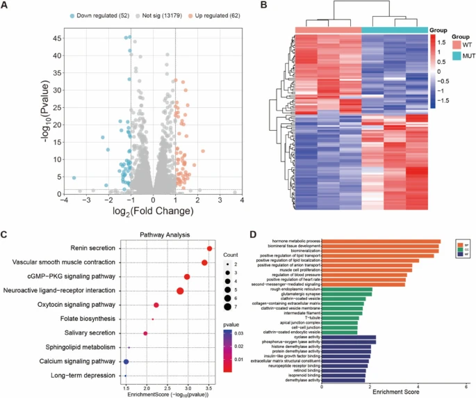 Fig. 6 A Volcano plot of differentially expressed genes (n = 3 technical replicates per group, single RNA-seq experiment). Green dots represent down-regulated genes, and red dots represent up-regulated genes (|log2FC|≥ 1 and adjusted p ≤ 0.05). B Heatmap showing the expression levels of transcripts in samples from the DPSCs-MUT and DPSCs-WT (n = 3 technical replicates per group). Red color refers to upregulation, and blue color refers to downregulation of gene transcription. C KEGG pathway analysis ranked the top 10 KEGG pathways (|log2FC|≥ 1 and adjusted p ≤ 0.05, based on 3 technical replicates per group). D Go results of biological process, cellular component, and molecular function (enrichment analysis based on differentially expressed genes with adjusted p ≤ 0.05, using 3 technical replicates per group). RNA sequencing was performed using Illumina platform with > 20 million clean reads per sample. Differential expression analysis was conducted using DESeq2 with Benjamini-Hochberg correction for multiple testing. Statistical significance: *adjusted p < 0.05, **adjusted p < 0.01, ***adjusted p < 0.001