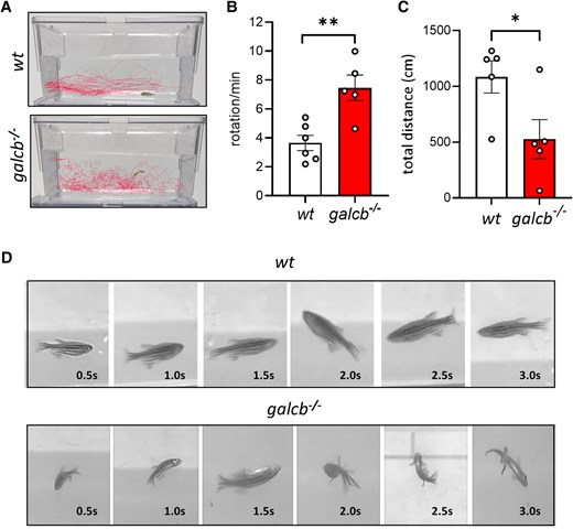 Fig. 2 Galcb knockout zebrafish exhibits impaired locomotion behaviour. (A) Representative swim behaviour tracking for wild-type (WT) and galcb knockout (KO) zebrafish at 4 months post fertilization (mpf). Alterations of fish locomotion of galcb KO mutants versus WT siblings was recorded for 5 min from the side view of the tank and quantified by measuring the number of body rotation/min (B) and total distance moved (C) using the Ethovision software equipped with a colour camera (five animals/group). Data are the mean ± standard error of the mean. Student's t-test: *P < 0.05, **P < 0.01. (D) Time frame images from Supplementary Video 1 showing the swim behaviour of WT and galcb KO zebrafish at 4 mpf.