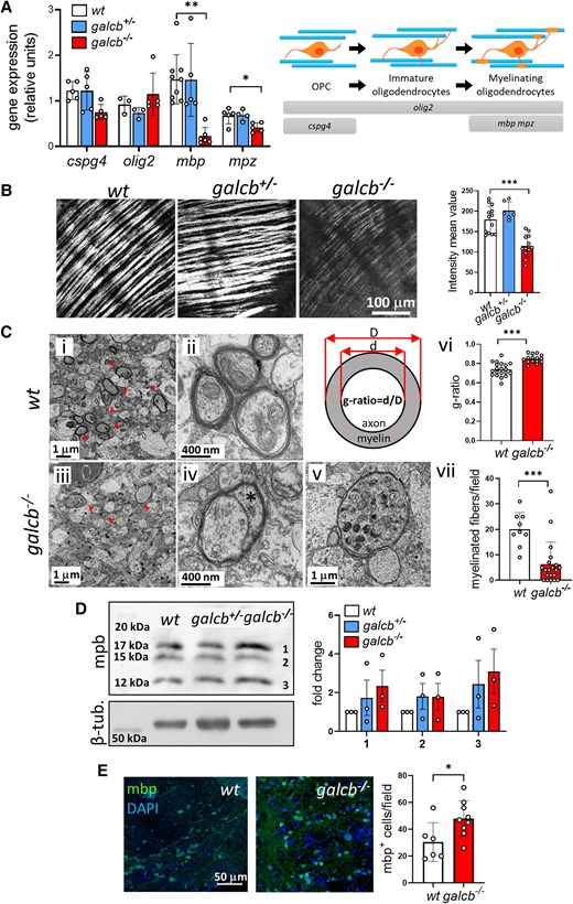 Fig. 3 Brain demyelination in galcb knockout zebrafish. (A) RT-qPCR analysis of the expression of oligodendrocyte (OL) and myelin marker genes cspg4, olig2, mbp and mpz in the brain of wild-type (WT), galcb+/− and galcb−/− zebrafish at 4 months post fertilization (mpf). For each gene, the data were normalized to its expression in one WT animal. Data are the mean ± standard deviation (SD) of 3–5 animals per group. Right: Schematic representation of OL differentiation and relative gene markers. (B) Spectral confocal reflectance microscopy analysis of the optic tectum of WT, galcb+/− and galcb−/− zebrafish at 4 mpf. Similar results were obtained in three animals per group. Right: Quantification of the myelin signal intensity in ≥ 6 microscopic fields/group. (C) Transmission electron microscopy analysis of the diencephalon of WT siblings (i and ii) compared with galcb knockout mutants (iii–v). Myelin structural alterations, thinner myelin sheets and degenerated axons characterized by cytoplasmatic accumulation of mitochondria and lysosomes are detectable in galcb−/− mutants. [C(vi)] g-Ratio was calculated for five myelin fibres in 3–4 microscopic fields. [C(vii)] Myelinated fibres (arrowheads) were counted in >10 microscopic fields/group. (D) Western blot analysis of mbp protein levels in the brain extracts of WT, galcb+/− and galcb−/− zebrafish at 4 mpf. β-tubulin was used as loading control. Right: Quantification of the three immunoreactive mbp protein bands does not show any statistical difference among the three experimental groups (data are from three independent experiments). (E) Immunofluorescence analysis shows the presence of numerous mbp-positive cells in the brain of galcb−/− zebrafish at 4 mpf. 4′,6-diamidino-2-phenylindole (DAPI) was used for nuclear counterstaining. Right: Quantification of mbp signal intensity in ≥6 microscopic fields/group. Data are the mean ± SD. One-way ANOVA (Tukey's multiple comparison test) in A, B and D; Student's t-test in C and E: *P < 0.05, **P < 0.01, ***P < 0.001. OPC = oligodendrocyte precursor cell; RT-qPCR = reverse transcriptase-quantitative PCR.