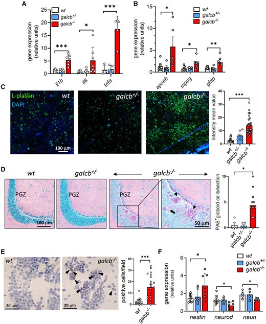 Fig. 4 Brain neuroinflammation and neurodegeneration in galcb knockout zebrafish. (A and B) RT-qPCR analysis of the expression of neuroinflammation-related genes interleukin-1b (il1b), il8, tumor necrosis factor-a (tnfa), apolipoprotein Eb (apoeb), macrophage expressed 1 (mpeg1) and glial fibrillary acidic protein (gfap) in the brain of wild-type (WT), galcb+/− and galcb−/− zebrafish at 4 months post fertilization (mpf). For each gene, the data were normalized to its expression in one WT animal. Data are the mean ± standard deviation of 5–7 animals per group. (C) Immunofluorescence analysis shows the presence of numerous L-plastin-positive cells in the brain of galcb−/− zebrafish at 4 mpf, absent in WT and galcb+/−siblings. 4′,6-diamidino-2-phenylindole (DAPI) was used for nuclear counterstaining. Right: Quantification of L-plastin signal intensity in ≥7 microscopic fields/group. (D) Periodic acid–Schiff (PAS) staining shows the presence of globoid cells (arrows) in the periventricular grey zone (PGZ) of the brain of galcb−/− zebrafish at 4 mpf, absent in WT and galcb+/−siblings. The number of PAS-positive globoid cells were counted in ≥4 microscopic sections/group. (E) Immunohistochemical analysis shows the increase of cleaved caspase3-positive cells in the brain of galcb−/− zebrafish at 4 mpf compared with WT siblings. The number of cleaved caspase3-positive cells were counted in at least 14 microscopic fields/group. (F) RT-qPCR analysis of the expression of neuronal marker genes nestin, neuronal differentiation 1 (neurod1) and RNA binding fox-1 homolog 3a (neun) in the brain of WT, galcb+/− and galcb−/− zebrafish at 4 mpf. For each gene, the data were normalized to its expression in one WT animal (n > 4 animals/group). Data are the mean ± standard deviation. One-way ANOVA (Tukey's multiple comparison test): *P < 0.05, **P < 0.01, ***P < 0.001. RT-qPCR = reverse transcriptase-quantitative PCR.