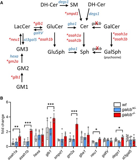 Fig. 6 Expression of enzymes involved in LacCer/cer metabolism in the brain of galcb knockout zebrafish. (A) Schematic representation of major metabolic pathways involved in LacCer/Cer metabolism. (B) The expression of the indicated genes has been assessed by RT-qPCR in the brain of wild-type (WT) and galcb knockout (KO) mutants at 4 months post fertilization. For each gene, the data were normalized to its expression in one WT animal. Data are the mean ± standard deviation of 4–6 animals per group. One-way ANOVA (Tukey's multiple comparison test): *P < 0.05, **P < 0.01, ***P < 0.001. In A, enzymes exhibiting upregulated gene expression in brains of galcb KO animals are marked by asterisks. LacCer = lactosylceramide; RT-qPCR = reverse transcriptase-quantitative PCR.