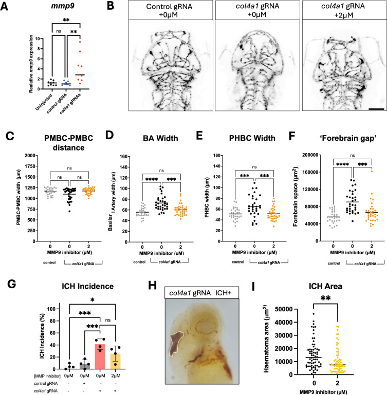 Fig. 4 Pharmacological inhibition of MMP9 rescues cerebrovascular defects and reduces haematoma expansion in col4a1 crispants. A. Relative levels of mmp9 transcript in col4a1 crispants. RNA extracted from 24 pooled whole zebrafish larvae at 3 dpf that were injected with either col4a1 targeting gRNAs or a control gRNA compared to uninjected siblings. Gene expression was calculated from RT-qPCR data using the comparative ΔΔCt method normalised to the gapdh and actin housekeepers and is relative to the uninjected control. Each data point is a biological repeat of which there were n = 9. Data were analysed with the Kruskal-Wallis test and Dunn’s post-hoc test. B. Representative inverted maximum intensity projections of the cerebrovasculature in Tg(kdrl: EGFP) col4a1 crispants treated with 0 or 2 µM MMP-9 inhibitor I (ab142180), and untreated control injected siblings. The zebrafish were live-imaged at 3 dpf using light-sheet microscopy in a dorsal orientation with a 20x objective and 0.7x digital zoom. The scale bar is 100 µm. C. The distance between both primordial midbrain channels (PMBC) vessels in µm. D. The mean width of the basilar artery (BA) measured in µm. E. The average width of the left and right primordial hindbrain channels (PHBC) measured in µm. F. The mean area in the forebrain absent of vessels measured in µm2. C-F. Data were analysed with the Kruskal-Wallis test and Dunn’s post-hoc test and presented as mean. Each data point is an individual fish (n = 30–36), results are from 3 biological replicates. Asterisks signify means that are significantly different at the 5 % level using the Tukey HSD test . G. The incidence of ICH in MMP9-inhibitor-I treated col4a1 crispants at 3 dpf compared to control injected siblings in larva stained with o-dianisidine. Data analysed with one-way ANOVA. Each value represents a pool of n = 25–50 embryos from 4 biological replicates. H. Representative image of an ICH+ col4a1 crispant stained with o-dianisidine at 3 dpf (haematoma indicated with white line). I. Haematoma area (µm2) quantification at 3 dpf in col4a1 crispants treated with 2 µM of MMP-9 inhibitor (n = 66) or without (n = 65). Data from 3 biological replicates and analysed with the Mann-Whitney T-test. For all tests ns P > 0.05, * P ≤ 0.05, **P ≤ 0.01, *** P ≤ 0.001 and **** P ≤ 0.0001.