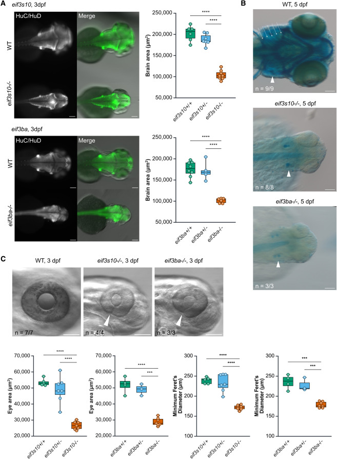 Fig. 5 eif3s10 and eif3ba loss-of-function mutants exhibit extracardiac abnormalities including reduced brain size, coloboma, reduced eye size, and craniofacial cartilage defects (A) Immunofluorescent staining for a pan-neuronal marker (HuC/HuD) reveals reduced brain size in mutants compared to WT siblings at 3 dpf. Quantification revealed a significant decrease in brain area for both eif3s10 and eif3ba mutants. Significance was determined by one-way ANOVA with Tukey multiple comparisons test; ∗p ≤ 0.05, ∗∗p ≤ 0.01, ∗∗∗p ≤ 0.001, and ∗∗∗∗p ≤ 0.0001. Each data point is one embryo, and n = 5–8 embryos. All scale bars: 100 μm. (B) Dorsal view of Alcian blue-stained embryos reveals a lack of facial cartilage (including jaw and pharyngeal arches) in mutant embryos compared to WT at 5 dpf. White arrowheads indicate otic vesicles, and white arrows indicate pharyngeal arches. All scale bars: 100 μm. (C) Mutant embryos have small eyes and coloboma at 3 dpf, with white arrowheads marking incomplete closure of the optic fissure. Quantification revealed a significant decrease in eye area and minimum Feret's diameter. All scale bars: 100 μm. Significance was determined by one-way ANOVA with Tukey multiple comparisons test; ∗p ≤ 0.05, ∗∗p ≤ 0.01, ∗∗∗p ≤ 0.001, and ∗∗∗∗p ≤ 0.0001. Each data point is one embryo (right eye measured only), and n = 3–7 embryos.