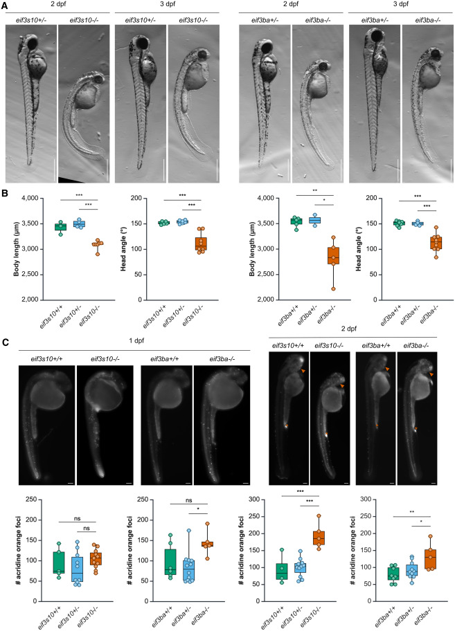 Fig. 3 Loss of eif3a and eif3b in zebrafish causes a spectrum of defects similar to those observed in affected individuals (A) Bright-field images of eif3s10−/− and eif3ba−/− embryos compared to heterozygous siblings at 2 and 3 dpf. Scale bars: 500 μm. Mutant embryos exhibit reduced size, delayed pigmentation, trunk curvature, and pericardial edema. (B) Body length is significantly reduced at 3 dpf for both eif3s10−/− and eif3ba−/− mutant embryos. Additionally, head angle is significantly reduced at 3 dpf, indicative of a growth delay. Significance was determined by one-way ANOVA with Tukey multiple comparisons test; ∗p ≤ 0.05, ∗∗p ≤ 0.01, and ∗∗∗p ≤ 0.001. Each data point is one embryo, body length n = 2–7, and head angle n = 4–9. (C) Acridine orange staining for apoptotic cells indicates a slight increase in apoptosis for eif3ba−/− embryos at 1 dpf, while there is no change for eif3s10−/− embryos. At 2 dpf, there is a significant increase in apoptosis for both eif3s10−/− and eif3ba−/− embryos when compared to their heterozygous or WT siblings. The orange asterisk (anal opening) and orange arrowhead (retina) indicate regions that have high levels of apoptosis during normal development; therefore, a high concentration of acridine orange is expected even in WT embryos. Significance was determined by one-way ANOVA with Tukey multiple comparisons test; ∗p ≤ 0.05, ∗∗p ≤ 0.01, and ∗∗∗p ≤ 0.001. Scale bars: 100 μm. Each data point is one embryo, 1 dpf n = 5–12 embryos, and 2 dpf n = 5–11 embryos.