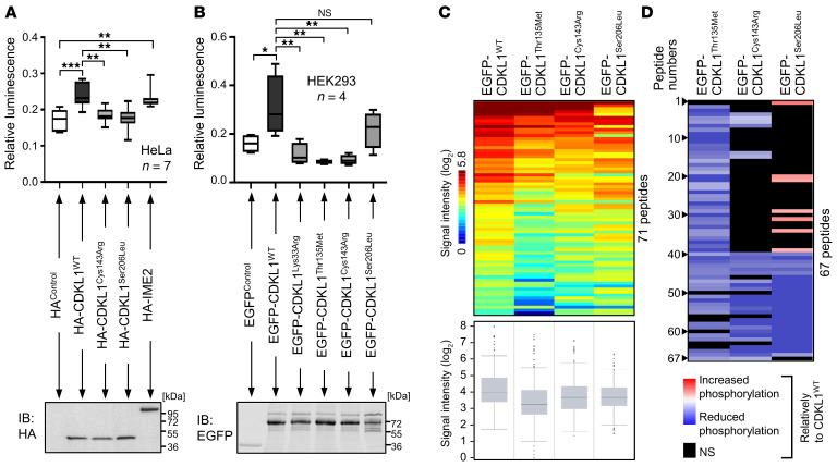 (A and B) In vitro kinase assays. HeLa (A) or HEK293T (B) cells were transiently transfected with CDKL1 and IME2 constructs or empty vectors (HAcontrol and EGFPcontrol). Fusion proteins were immunoprecipitated and subjected to kinase assays using peptide substrate RPRSPGARR and the ADP-Glo kinase assay (Promega). Luminescence intensities of individual measuring points were normalized to the entire luminescence signal of an experiment and to the amount of immunoprecipitated protein (n = 7, A; n = 4, B). Medians (50th percentiles, lines in boxes) as well as 0th, 25th, 75th, and 100th percentiles are given in the box plots. Small aliquots were removed from precipitates and subjected to immunoblotting using anti-HA (A) and anti-GFP (B) antibodies; representative blots are shown. *P ≤ 0.05, **P ≤ 0.01, ***P ≤ 0.001, 1-way ANOVA with Dunnett’s post hoc multiple-comparison test. (C) CDKL1 serine/threonine phosphorylation profiling. EGFP-tagged CDKL1 variants were expressed in HEK293T cells, purified using GFP-Trap (ChromoTek), and applied to STK-PamChip arrays (PamGene). Seventy-one peptides passed quality control. The heatmap displays average log2-transformed signal intensities for indicated CDKL1 variants. The signals were sorted from high (red) to low (blue) intensity that corresponds to phosphorylation levels. To visualize overall sample variance and group differences, peptide phosphorylation and overall kinase activity are shown in box plot representation. (D) Peptide substrates with significantly changed phosphorylation. The heatmap shows significantly differentially phosphorylated peptides between samples treated with disease-associated CDKL1 variants versus CDKL1WT. The effects of CDKL1 variants are log ratios [log2(disease-associated CDKL1 variant)/log2(CDKL1WT)]. Blue and red indicate reduced and increased phosphorylation, respectively. Peptides that did not pass the significance threshold (P < 0.05, disease-associated CDKL1 variant vs. CDKL1WT) are black. Peptide numbers correspond to those in Supplemental Table 2, where details on the substrates are also described.