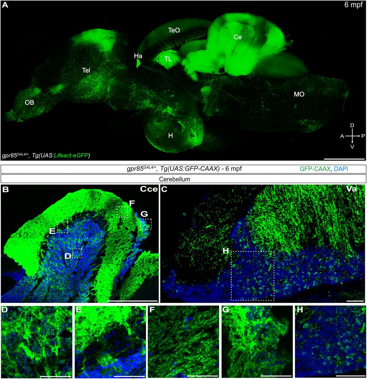 Fig. 2 Cartography of gpr85 expression in the brain of adult zebrafish. A, Maximum projection confocal images of native Lifeact-eGFP fluorescence in a cleared adult brain hemisphere (sagittal view) from a gpr85GAL4/+, Tg(UAS:Lifeact-eGFP) fish. Scale bar, 500 µm. B–H, Maximum projection confocal images of brain sections from a gpr85GAL4/+, Tg(UAS:GFP-CAAX) adult zebrafish stained with anti-GFP (green) and DAPI (blue). B, Sagittal sections of corpus cerebelli (Cce). The boxes indicate the boxes in A indicate the regions enlarged in panels D–G. C, Sagittal sections of valvula cerebelli (Va). The box in C indicates the region enlarged in panel H. D, GCL. E, PCL. F, Molecular layer. G, Lca. H, valvula cerebelli. (N = 3) Scale bars, (C, D, E, F, G, H) 50 µm, (B) 500 µm.