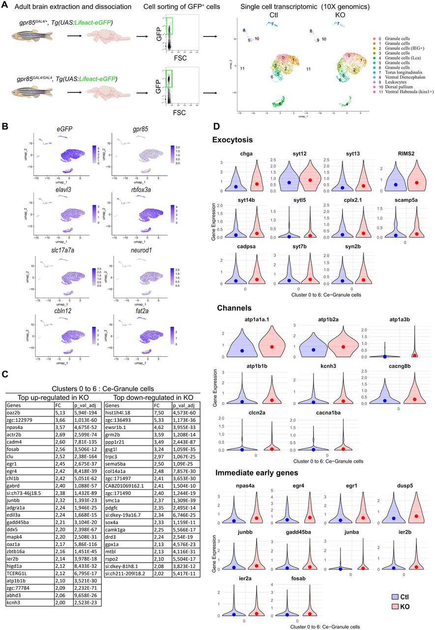 Fig. 6 scRNAseq analysis of eGFP+ sorted cells from adult gpr85GAL4/+ and gpr85GAL4/GAL4, Tg(UAS:lifeact-eGFP) dissociated brains reveals changes in gene expression related to neuronal activity. A, Experimental strategy for assessing transcriptomic changes in gpr85-expressing cells from the Gpr85-deficient adult brain. GFP+ cells were sorted from gpr85GAL4/+ (Ctl) and gpr85GAL4/GAL4 (KO), Tg(UAS:lifeact-eGFP) dissociated brains (cell sorting strategy shown with 10,000 events per condition). The right panel shows the UMAPs of cells from the Ctl and KO conditions (n = 4,219 cells and n = 3,341 cells, respectively) after filtering and clustering. B, UMAPs of Ctl and KO cells merged, displaying expression of the UAS:lifeact-eGFP transgene, gpr85, the two pan-neuronal markers elavl3 and rbfox3a, as well as the expression of the GC markers, sls17s7a, neurod1, cbln12, and fat2a. C, Table of the most up- and downregulated genes within the isolated cerebellar clusters (0 to 6) in the KO condition, with a minimal FC of two and an adjusted p < 10−4, expressed by at least 6% of the cells. D, Violin plots of most significantly DEGs with a minimal FC of 1.4 and an adjusted p < 10−4. All genes referenced are upregulated (mean represented by the dots). Top panel, Selection of genes related to exocytosis. Intermediate panel, Selection of genes encoding channels related to neuronal excitability/activity (voltage-dependent channels, clcn2a, cacna1ba, kcnh3, cacng8b; Na+/K+ ATPase subunits, atp1a3b, atp1b1b, atp1a1a.1, atp1b2a, syn2b). Lower panel, genes documented as IEGs.