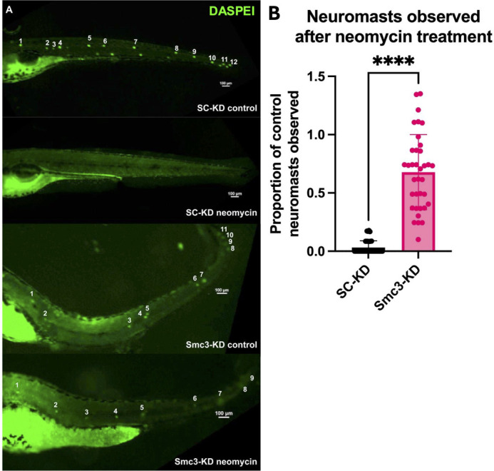 Smc3 protein depletion protects lateral line neuromasts from neomycin cytotoxicity. (A) Representative images of lateral line neuromasts in SC-KD larvae and Smc3-KD larvae at 5 dpf with and without neomycin treatment and stained with 2-[4-(Dimethylamino)styryl]-1-ethylpyridinium iodide (DASPEI). Scale bars: 100 µm. (B) Quantification of neuromast survival after neomycin treatment for each injection type. Neuromast survival was calculated as the ratio of observed neuromasts in each neomycin-treated embryo to the average number of neuromasts visible in control-treated embryos of the same injection type (e.g. SC-KD or Smc3-KD). By this method, ratios greater than 1 may occur if the number of observed neuromasts in a neomycin-treated embryo exceeds the average number of neuromasts observed in the relevant control-treated embryos. Student's t-test, ****P<0.0001, SC-KD n=40, Smc3-KD n=36.